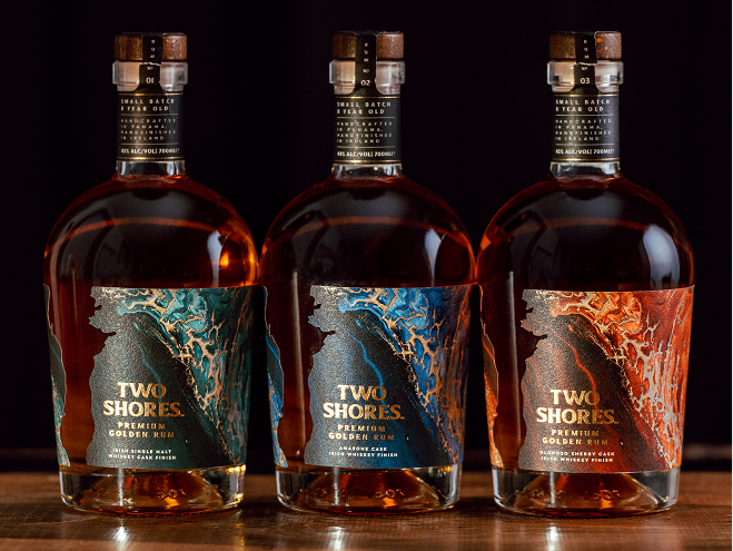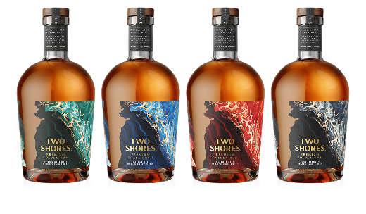 Two Shores Rum, a premium golden rum distinguished by its unique aging process.